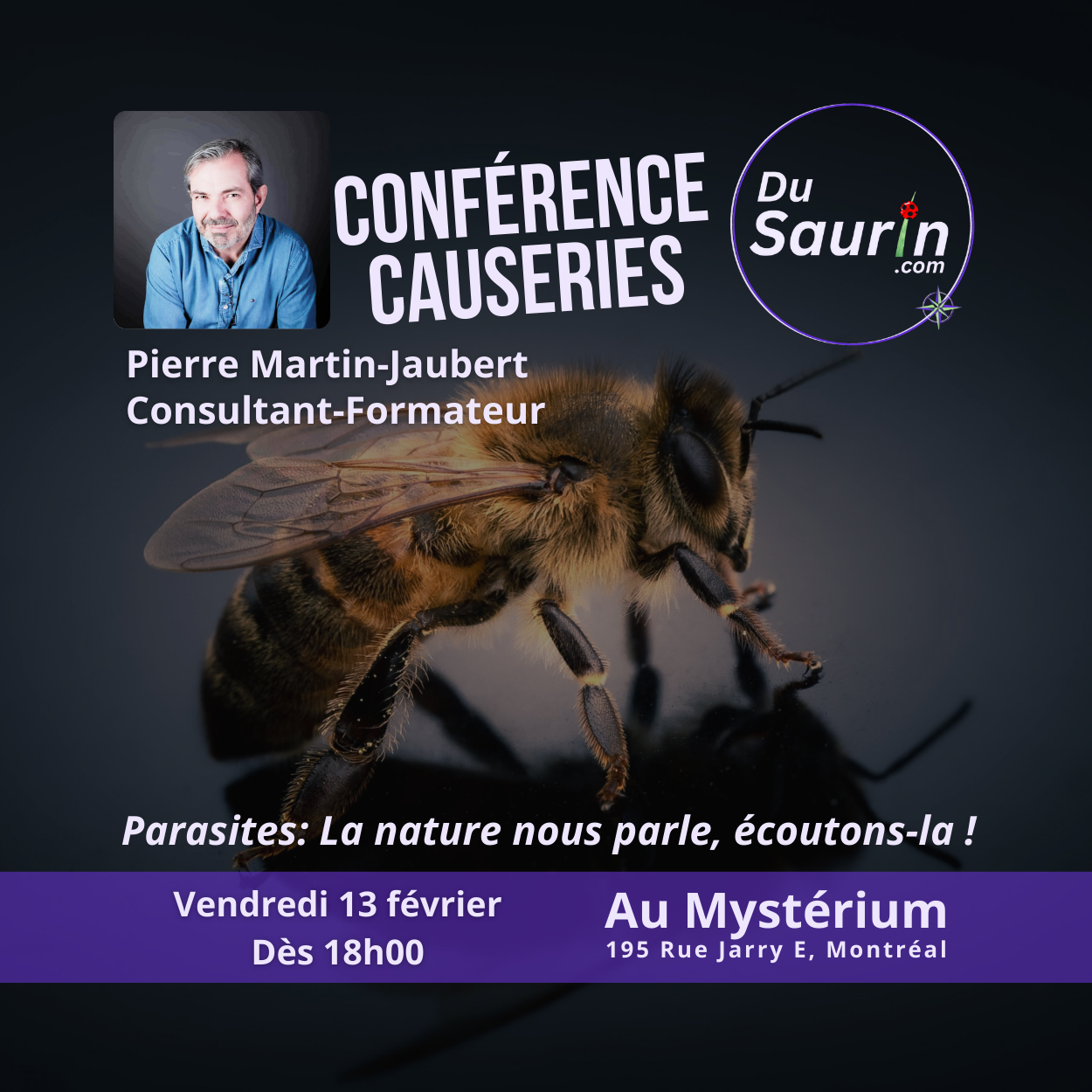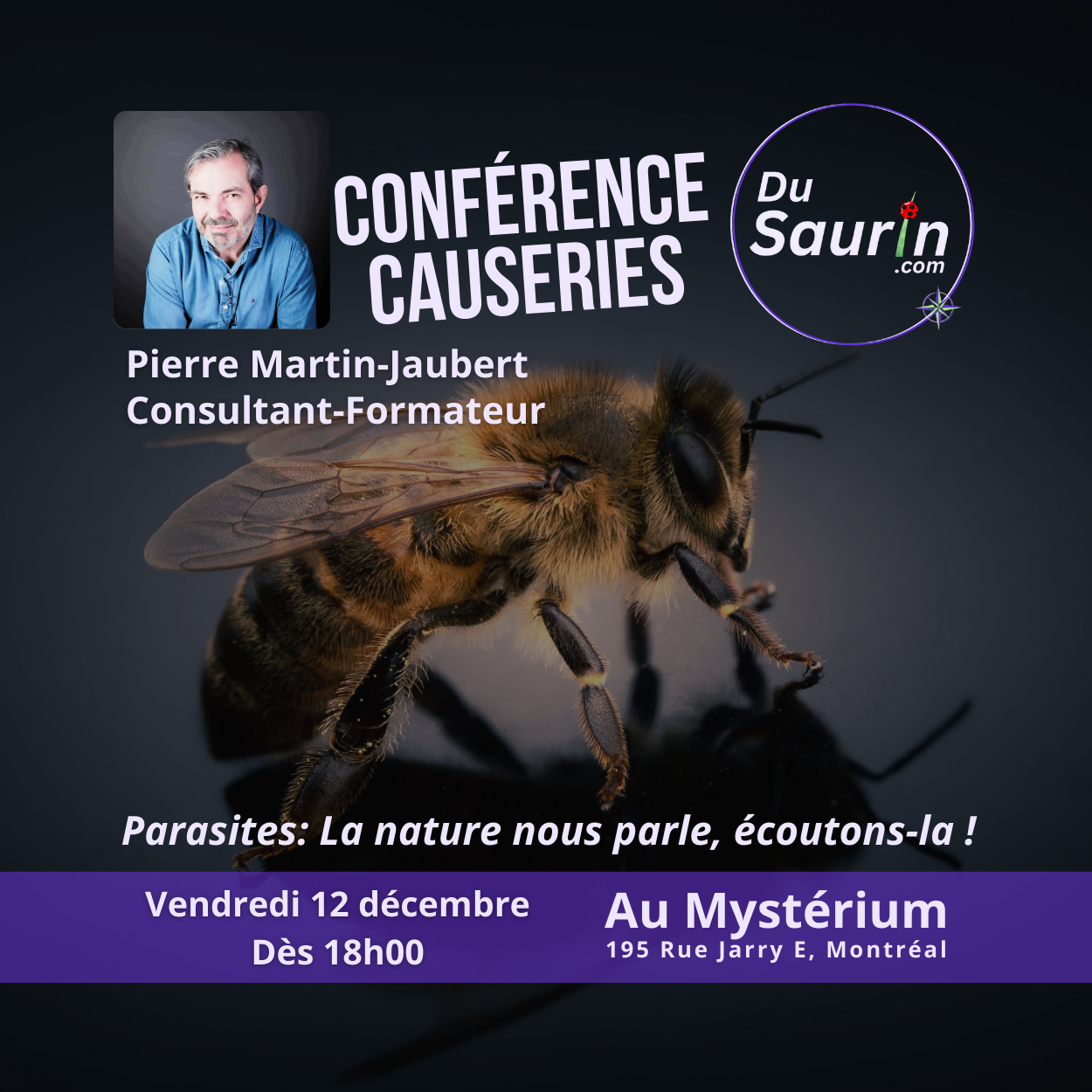 Conférence-Causeries - Mystérium 195, Jarry Est,Montréal,Québec,CanadaLe 12 septembre dès 18h, plongez dans un espace intime où 20 passionnés échangent, questionnent et découvrent ensemble la biologie, la signification énergétique et les messages de la nature à travers les animaux et insectes.